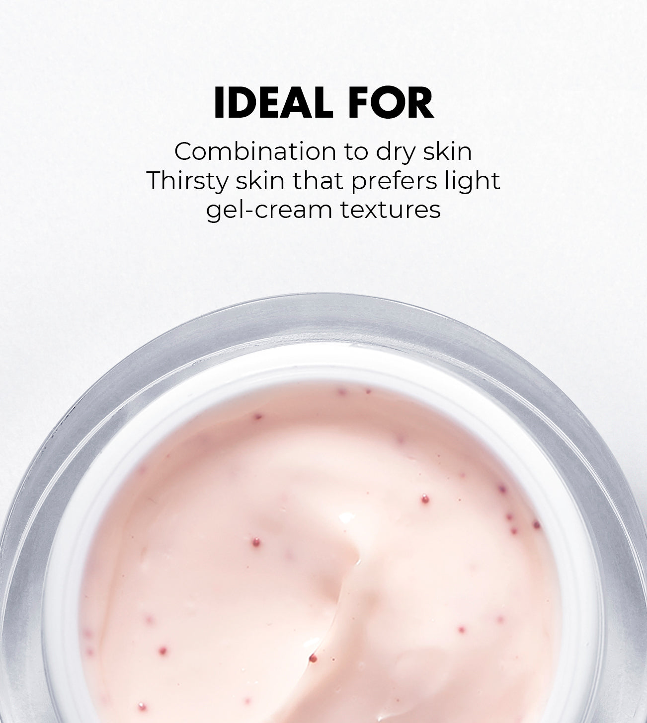 Diese sehr feine Gel-Creme wurde speziell für die feuchtigkeitsarme Haut entwickelt, die leichte Texturen bevorzugt. Eine außergewöhnliche Pflege für eine intensive, sofortige und langanhaltende Feuchtigkeitsversorgung. Ihre Formel ist reich an pflanzlichen und biotechnologischen Wirkstoffen, die Feuchtigkeit spenden und binden, mit zusätzlichem regenerierendem und antioxidativem Effekt.