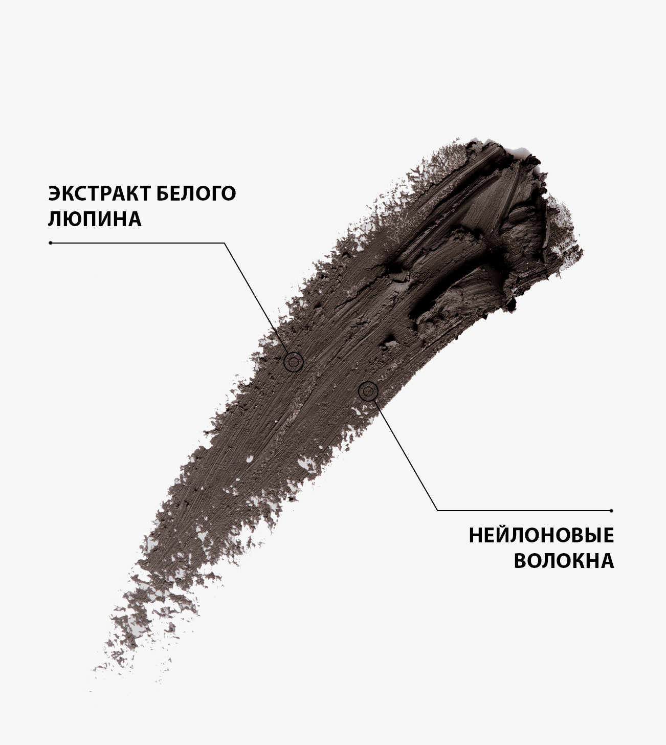 Sa formule crème soyeuse contient des extraits de Lupin Blanc riches en peptides glutaminés, oligo-éléments et vitamines aux propriétés revitalisantes. Des fibres de Nylon viennent se déposer sur les sourcils et les cils pour leur apporter volume et densité.