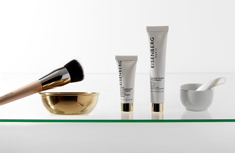 Routine Pre-Makeup: Masque Tenseur Remodelant 15 ml, Crème Raffermissante Remodelante 5 ml e un pennello fondotinta EISENBERG.