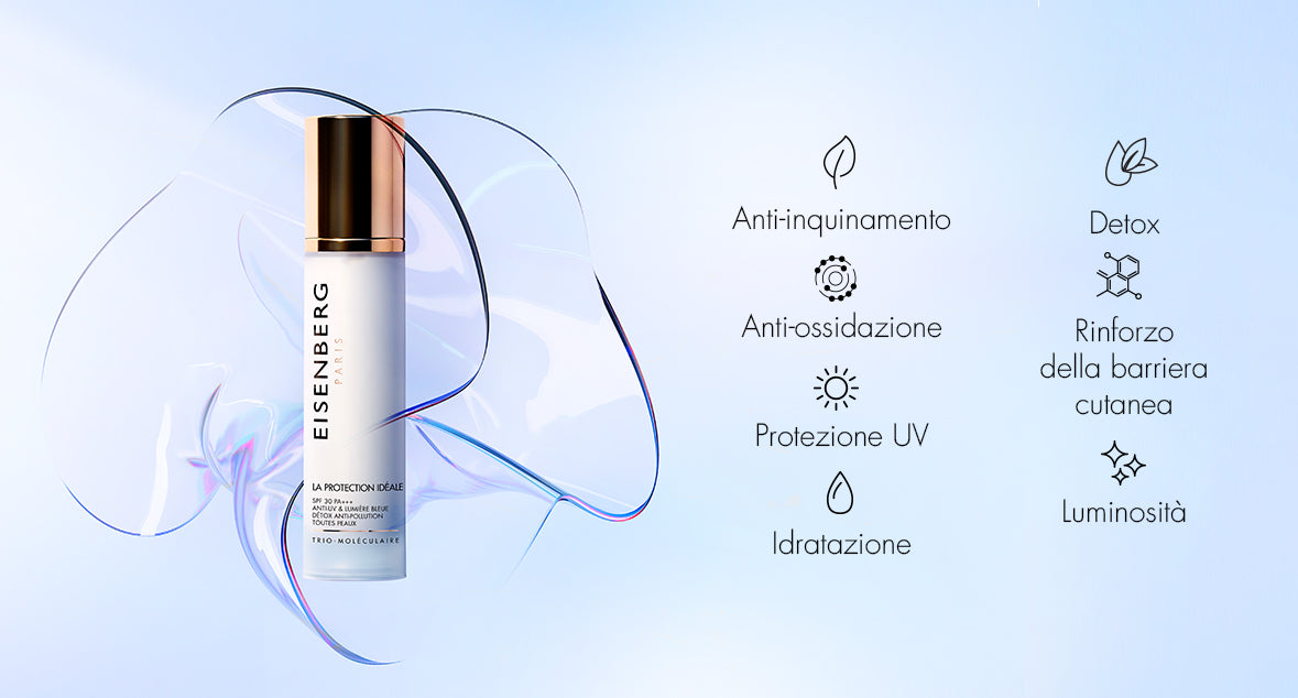 Dopo 10 anni di ricerca intensiva, EISENBERG presenta: La Protection Idéale SPF 30 PA +++, un trattamento da giorno anti-età globale che offre una protezione 3 in 1 contro l'invecchiamento cutaneo precoce. Un crema innovativa idratante quotidiana all-in-one che associa i benefici della protezione UV, della protezione anti-inquinamento e della protezione anti luce blu. Un'emulsione idratante anti-età di estrema leggerezza, adatta anche alle pelli sensibili.