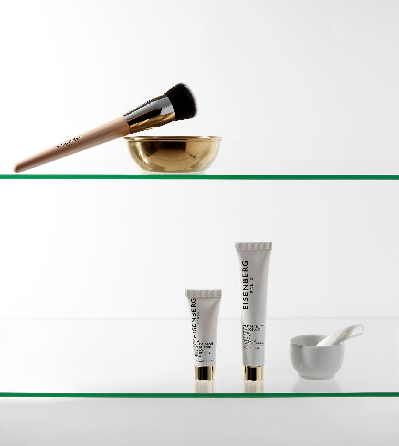 妆前护理套装:15毫升Masque Tenseur Remodelant、5毫升Crème Raffermissante Remodelante 和一支EISENBERG粉底刷。